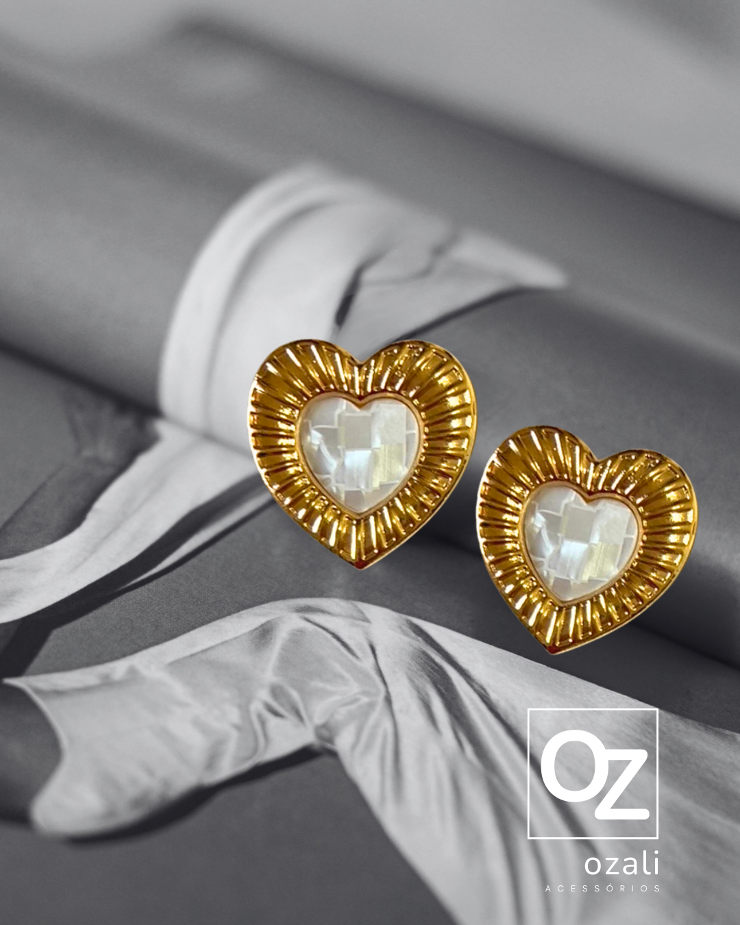 Brinco coração de pérola – Brinco de metal dourado e texturizado, detalhe em pérola resinada no centro, combinação perfeita para momentos especiais como festas divertidas ou cerimoniais.