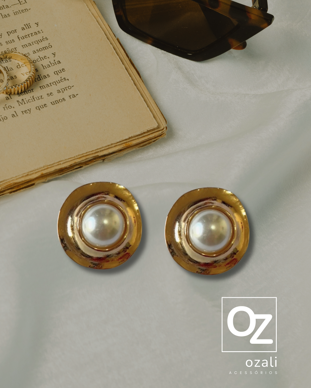 Brinco assimétricamente redondo em tela dourado com detalhe em pérola, combinação perfeita para momentos especiais