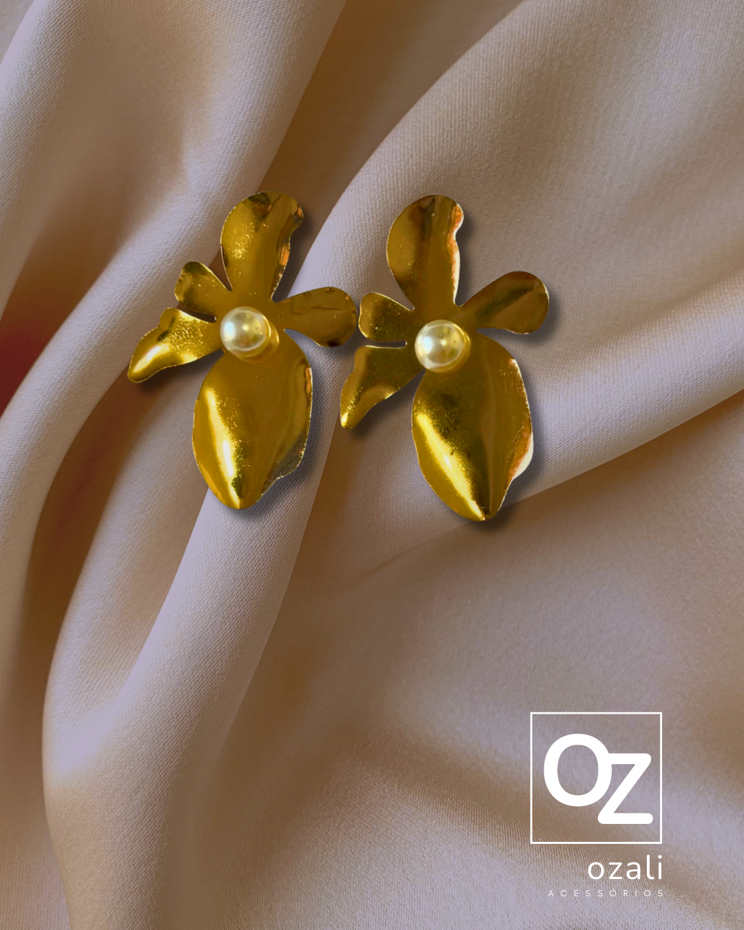 Brinco Flor de orquídea com pérola – Max grande de metal dourado e liso, detalhe em pérola resinada, combinação perfeita para  momentos especiais como festas divertidas ou cerimoniais.